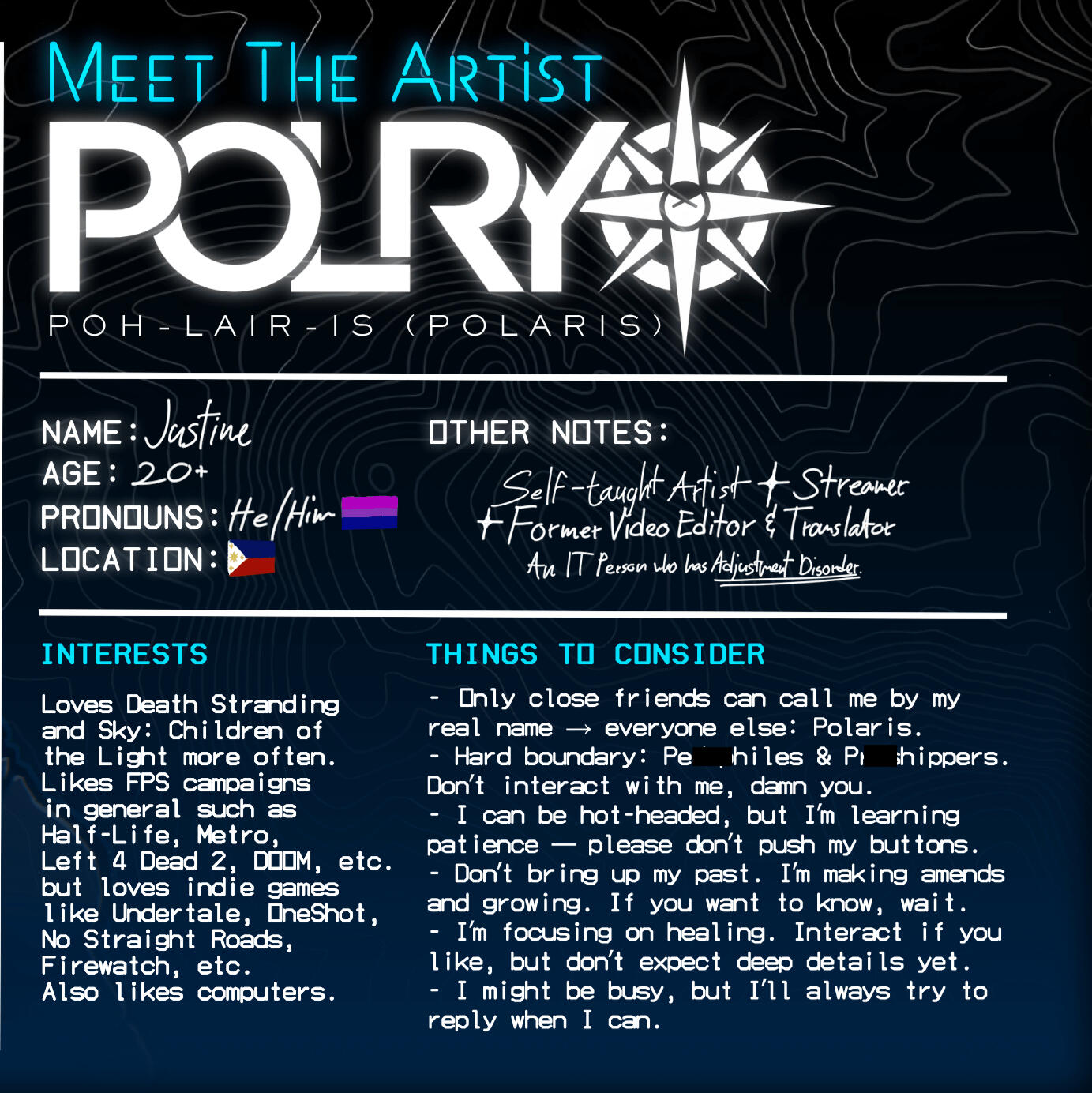 Message as of September 30, 2025: Hello, bad news came up to me recently.The file for my authentication codes has a password on it which I don't remember. As a result, I got locked out from it permanently.Most of my accounts in there are recoverable except Carrd, which means I'll have to re-create a newly made carrd site which this one. :(https://polryx.carrd.co/ will be abandoned and this will be my new current one from now on. Thank you for understanding. -Polryx
